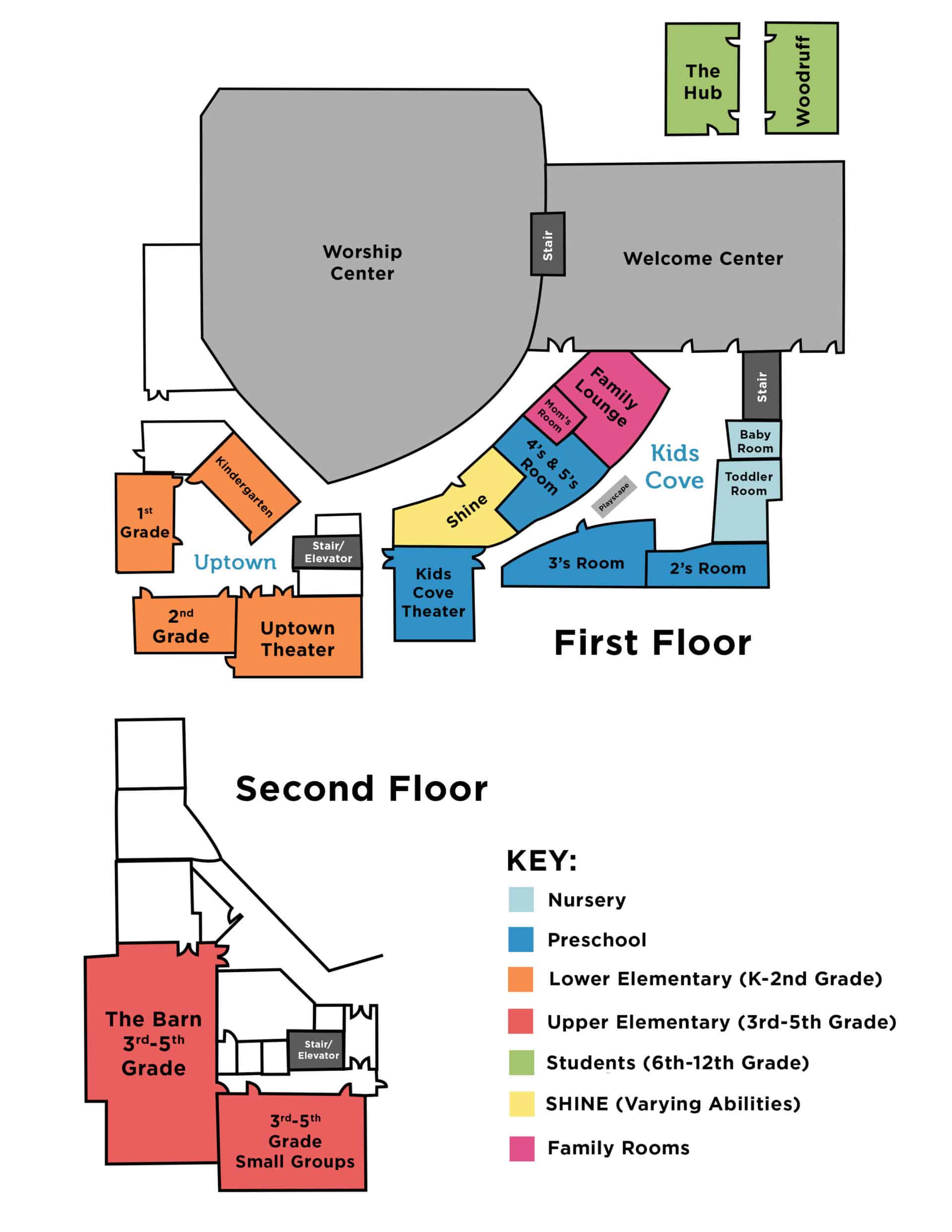 - Then, you will drop off your child at Kids Cove (Birth-age 5), Uptown (Grades K-2), or The Barn (Grades 3-5).