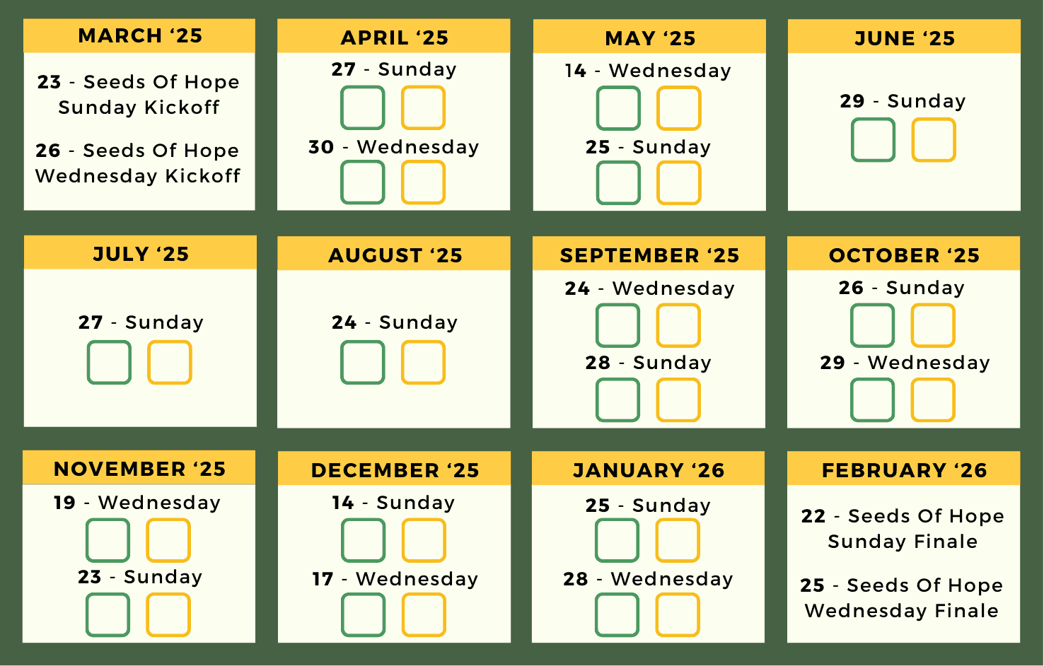 Give to Reach Our Goal: Use your Seeds of Hope Giving Box to collect money! Each month, on the last Sunday or Wednesday, bring your collection in an envelope and drop it off in the special Seeds of Hope donation box at the Prayer Trees. We’ll be collecting donations from now until February 2026.