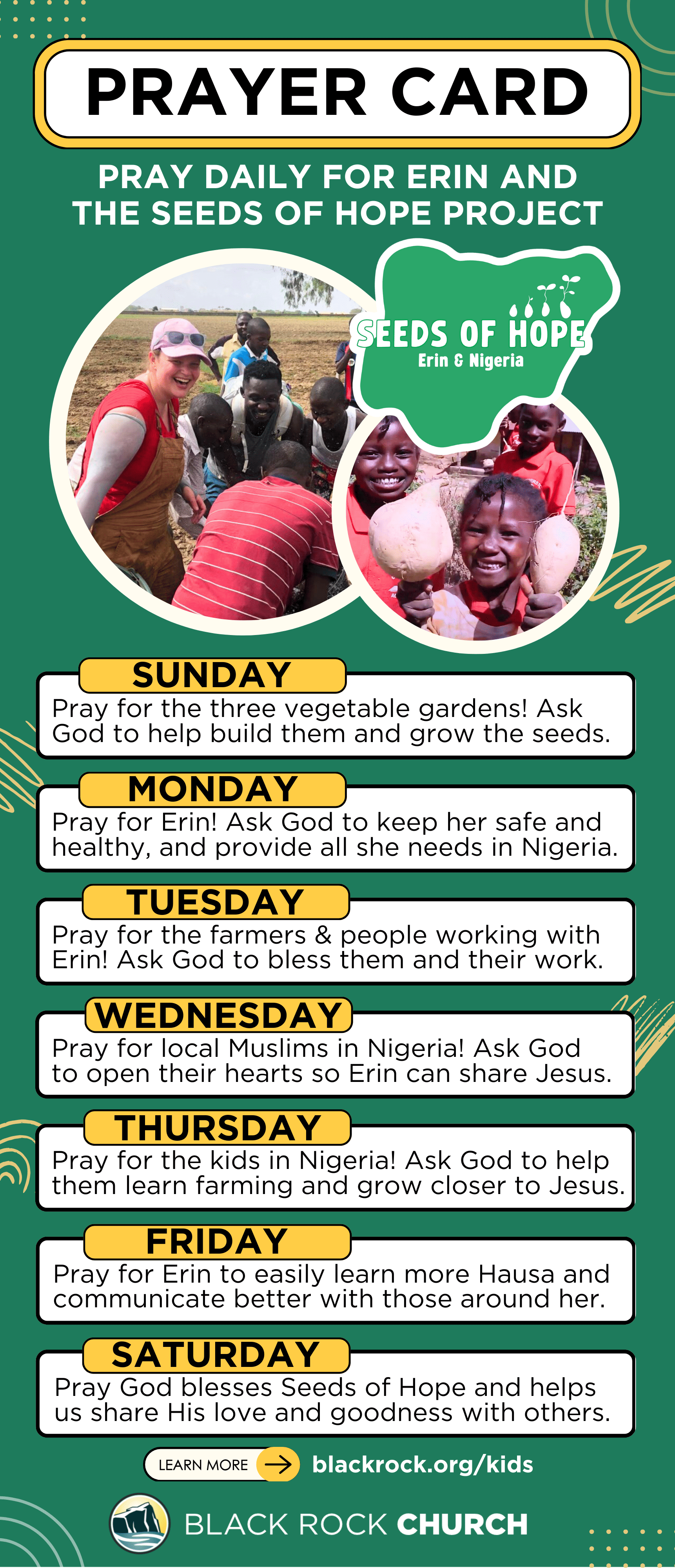 Pray for Erin & the Kids: Join us in praying for Erin, her impactful work in Nigeria, and the Seeds of Hope project. Use the Prayer Card prompts to guide your family in daily prayer. By participating, you’re not only supporting Erin and the kids in Nigeria, but also teaching your kids the importance of prayer and Global Outreach.